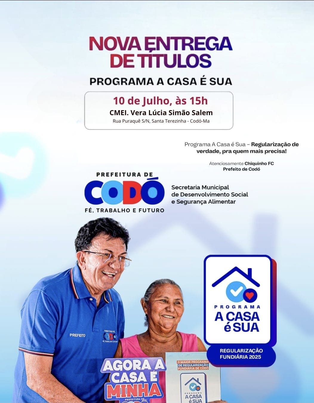 Em Foco Prefeitura de Codó realiza nova entrega de títulos do programa “A Casa é Sua” nesta quinta-feira (10) 9 de julho de 2025 Nenhum comentário
