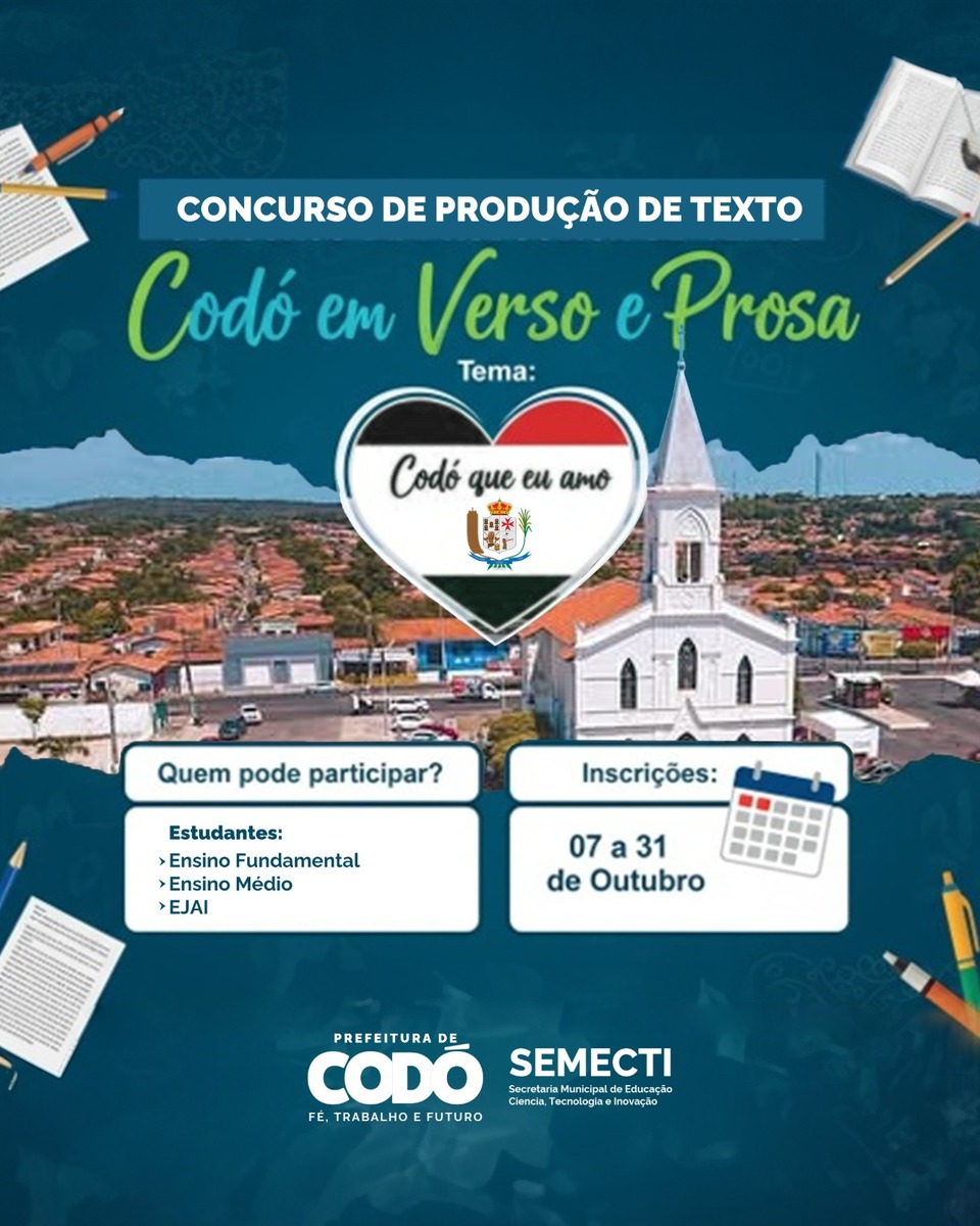 Maranhão Prefeitura de Codó lança concurso literário “Codó em Verso e Prosa” para incentivar leitura e criatividade de estudantes 15 de outubro de 2025 Nenhum comentário