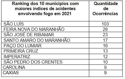 Em 2021, as cidades com maior ocorrência de queimadas próximo à rede elétrica foram: São Luís (103 ocorrências), Feira Nova do Maranhão (38 ocorrências) e São José de Ribamar (23 ocorrências). Imperatriz e Caxias se encontram no ranking dos 10 municípios com maior quantidade de acidentes envolvendo queimadas, ocupando a 7ª e 10ª posição respectivamente.
