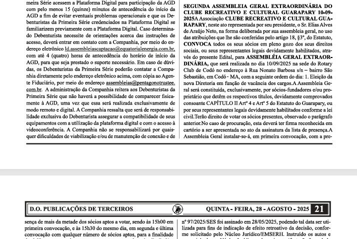 A Associação CLUBE RECREATIVO E CULTURAL GUARAPARY, neste ato representada por seu presidente, o Sr. Elias Alves de Araújo Neto, na forma deliberada por sua assembleia geral, no uso das atribuições que lhe são conferidas pelo artigo 18, §3º, do Estatuto, CONVOCA todos os seus sócios em pleno gozo dos seus direitos sociais, ou seus representantes legais devidamente habilitados, através do presente Edital, para ASSEMBLÉIA GERAL EXTRAORDINÁRIA, que será realizada no dia 10/09/2025, na sede do Rotary Club de Codó, localizado na Rua Nonato Barbosa s/n, bairro São Sebastião, em Codó – MA.