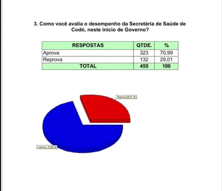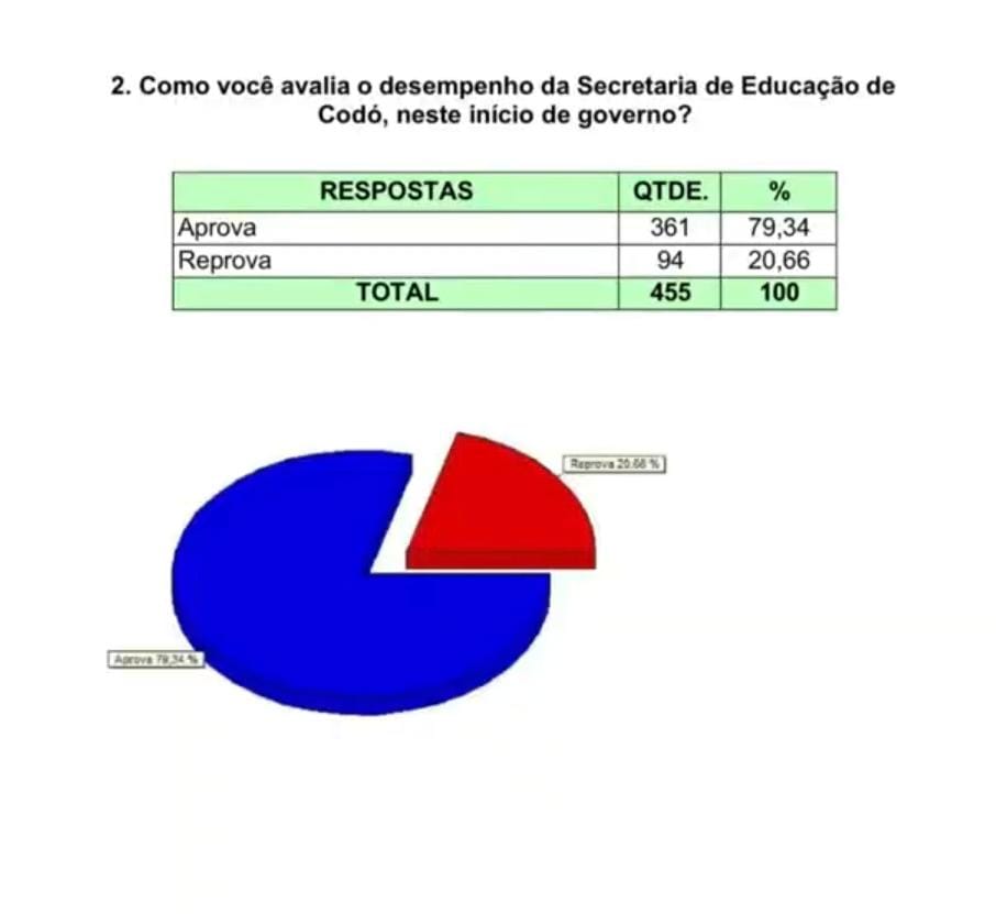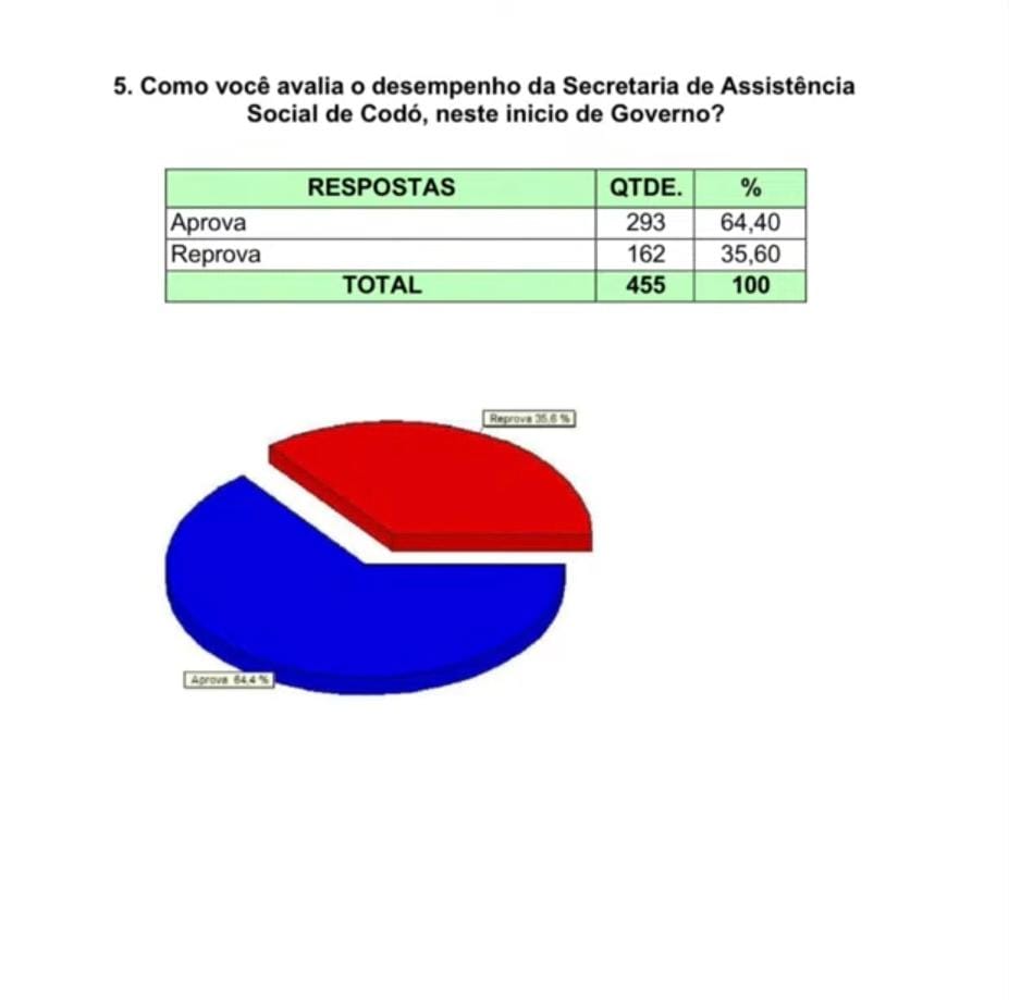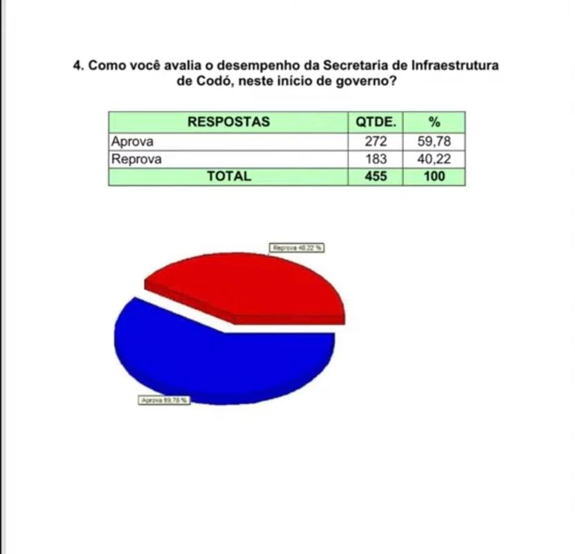 O levantamento avaliou os principais setores da administração municipal, como educação, saúde, infraestrutura, agricultura e assistência social. A maioria dos entrevistados demonstrou satisfação com as ações desenvolvidas pela Prefeitura de Codó nesse início de governo.