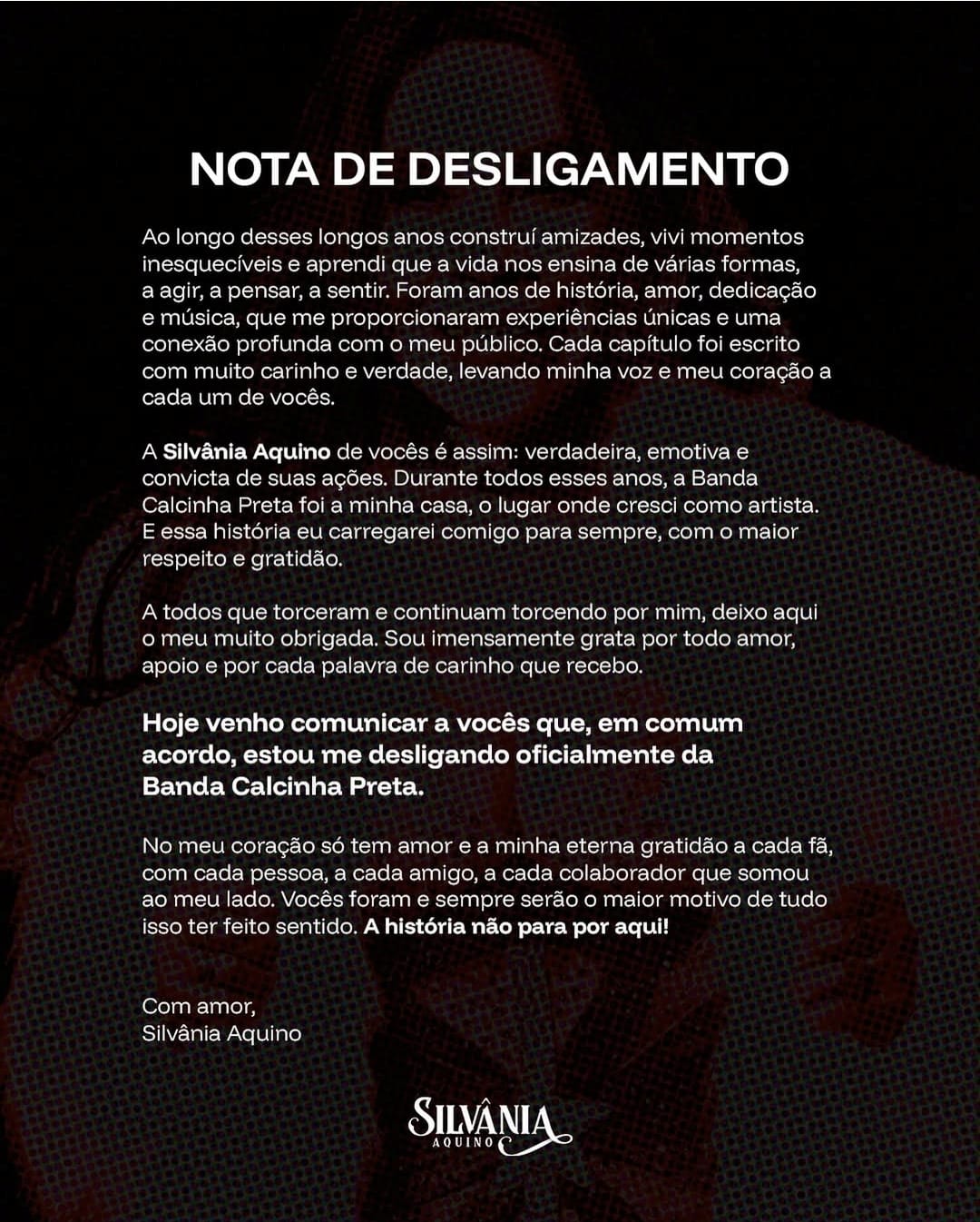 Na mensagem, Silvânia relembra momentos marcantes da carreira e destaca o aprendizado ao longo do tempo. “Foram anos de história, amor, dedicação e música, que me proporcionaram experiências únicas e uma conexão profunda com o meu público”, escreveu.